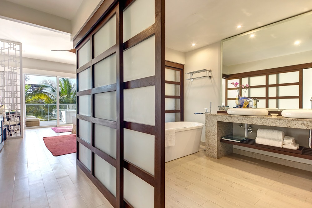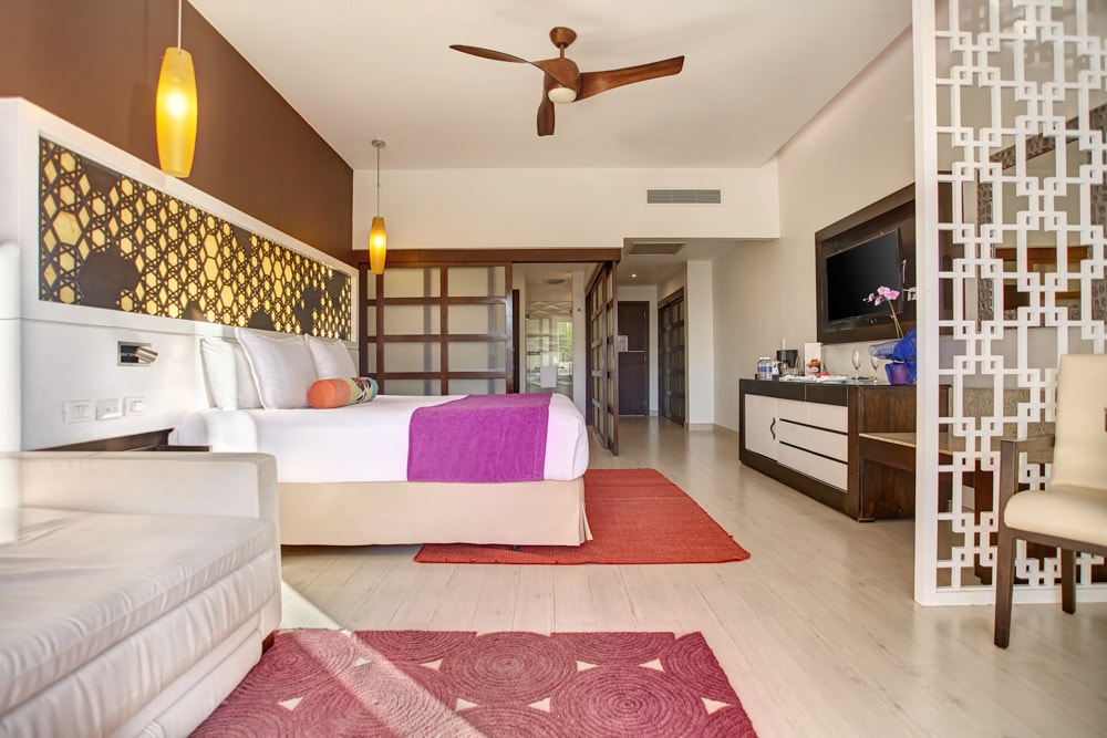 Suites with King Bed and 1 comfortable Double Sofa Bed, large bedroom, full bathroom with separated toilet and indoor Whirlpool. Enjoy an integrated living area and a magnificent terrace overlooking the ocean with your own chaise lounges and outdoor Whirlpool. Max Occupancy: 4 Adults or 3 Adults + 1 Child or 2 Adults + 2 Children
